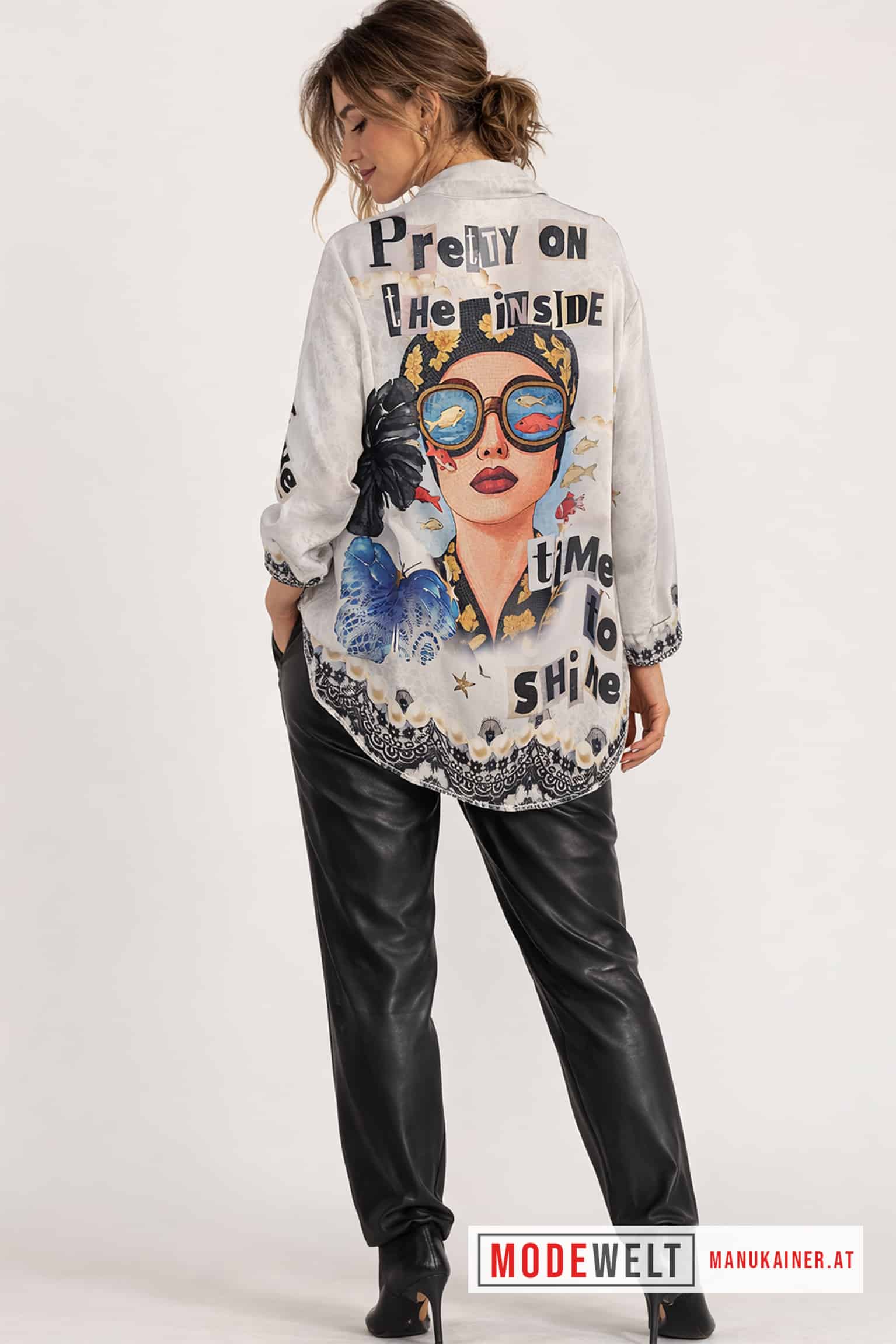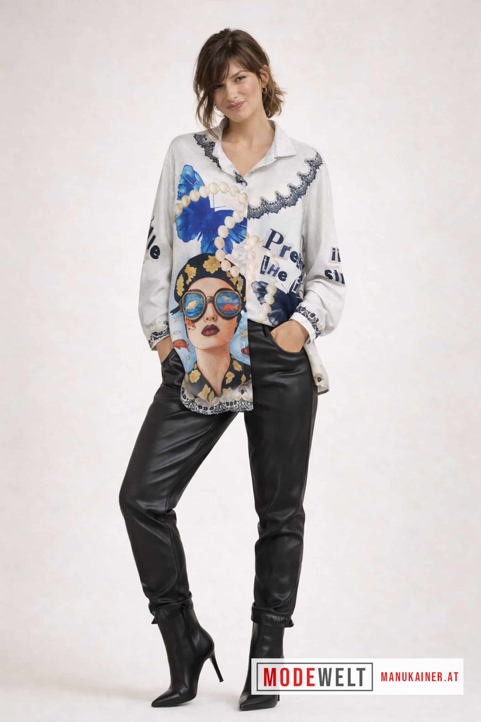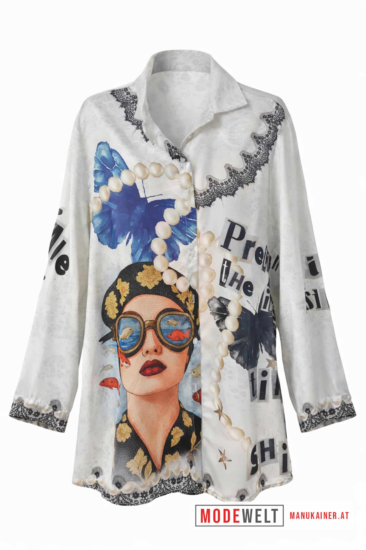 Diese Trendbluse vereint künstlerisches Design mit moderner Eleganz. Der außergewöhnliche Print mit stilisiertem Portrait, Perlenmotiv und maritimen Elementen verleiht dem Look eine besondere Ausdruckskraft. Die locker fallende Passform sorgt für angenehmen Tragekomfort und eine schmeichelhafte Silhouette. Ob elegant kombiniert oder lässig gestylt – diese Bluse wird zum stilvollen Blickfang in jeder Garderobe.