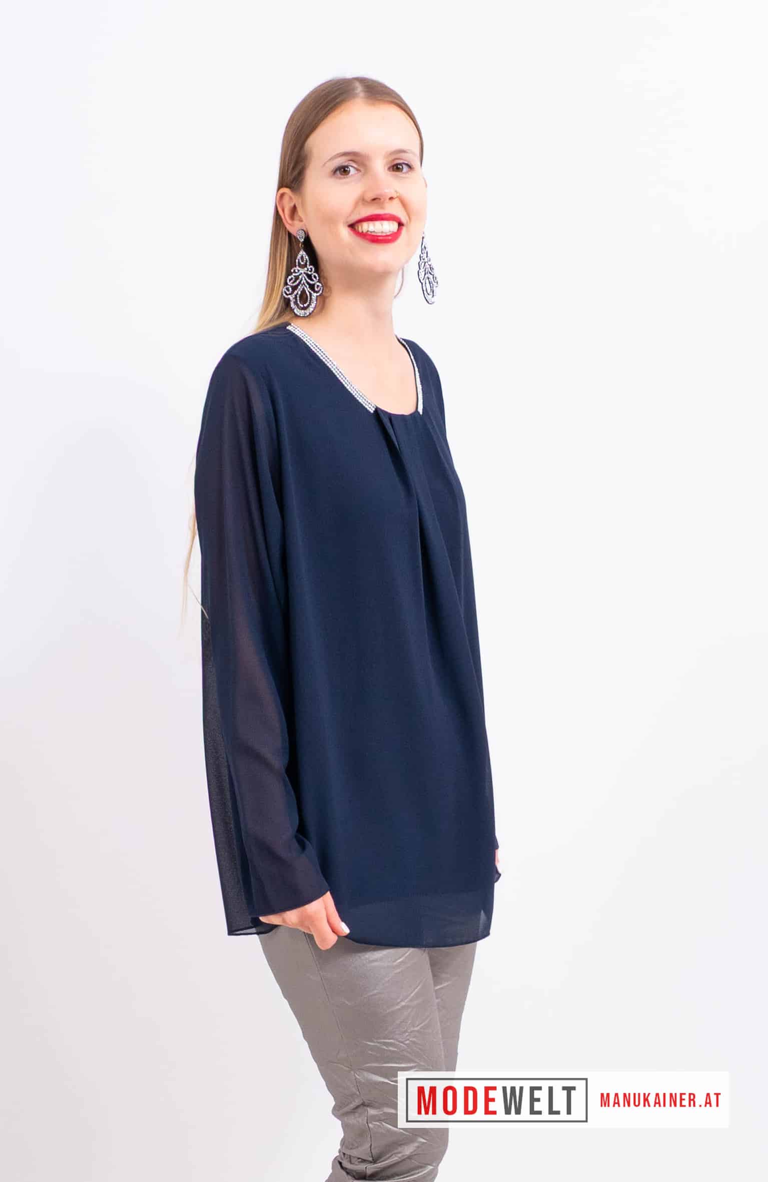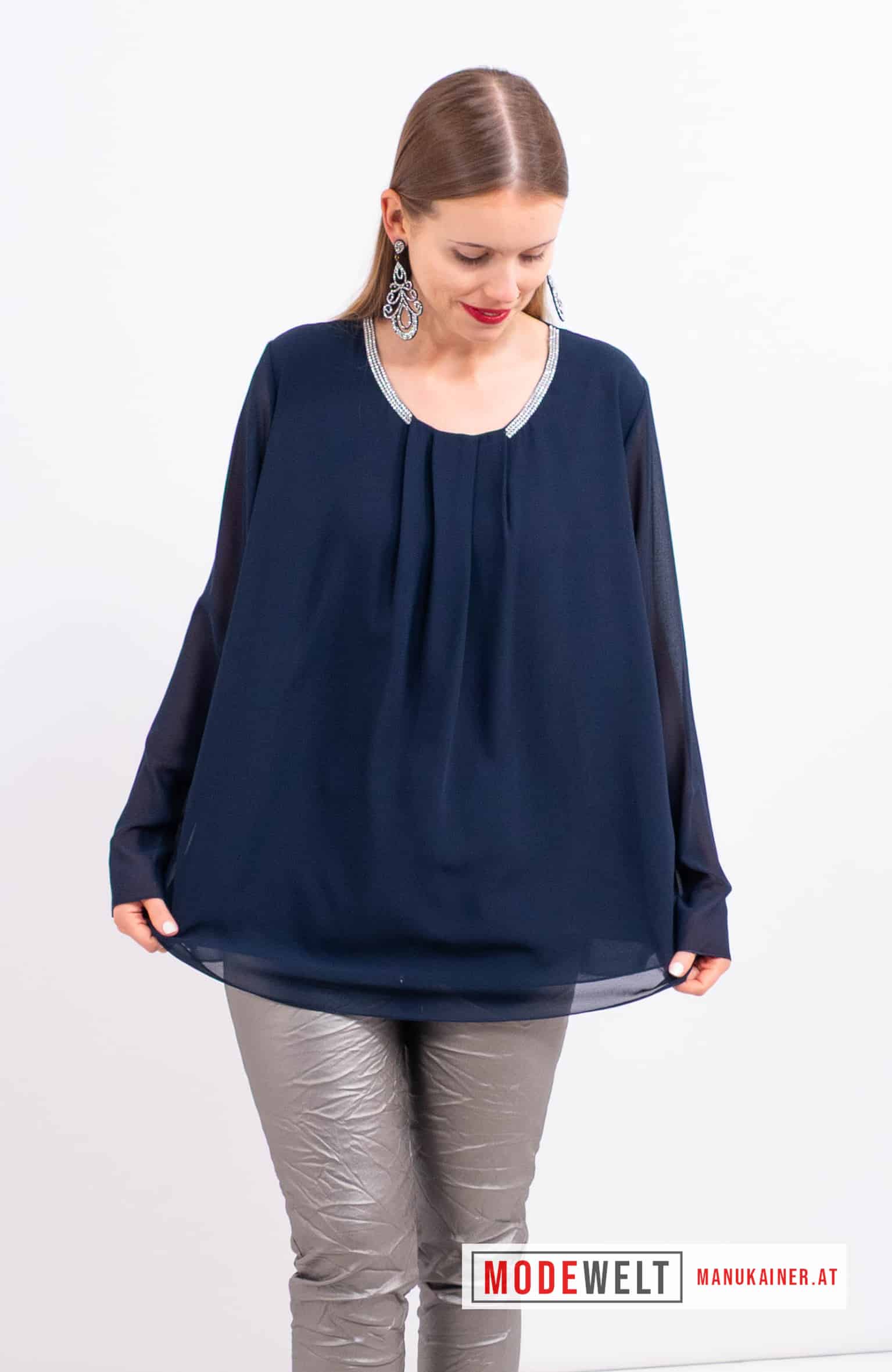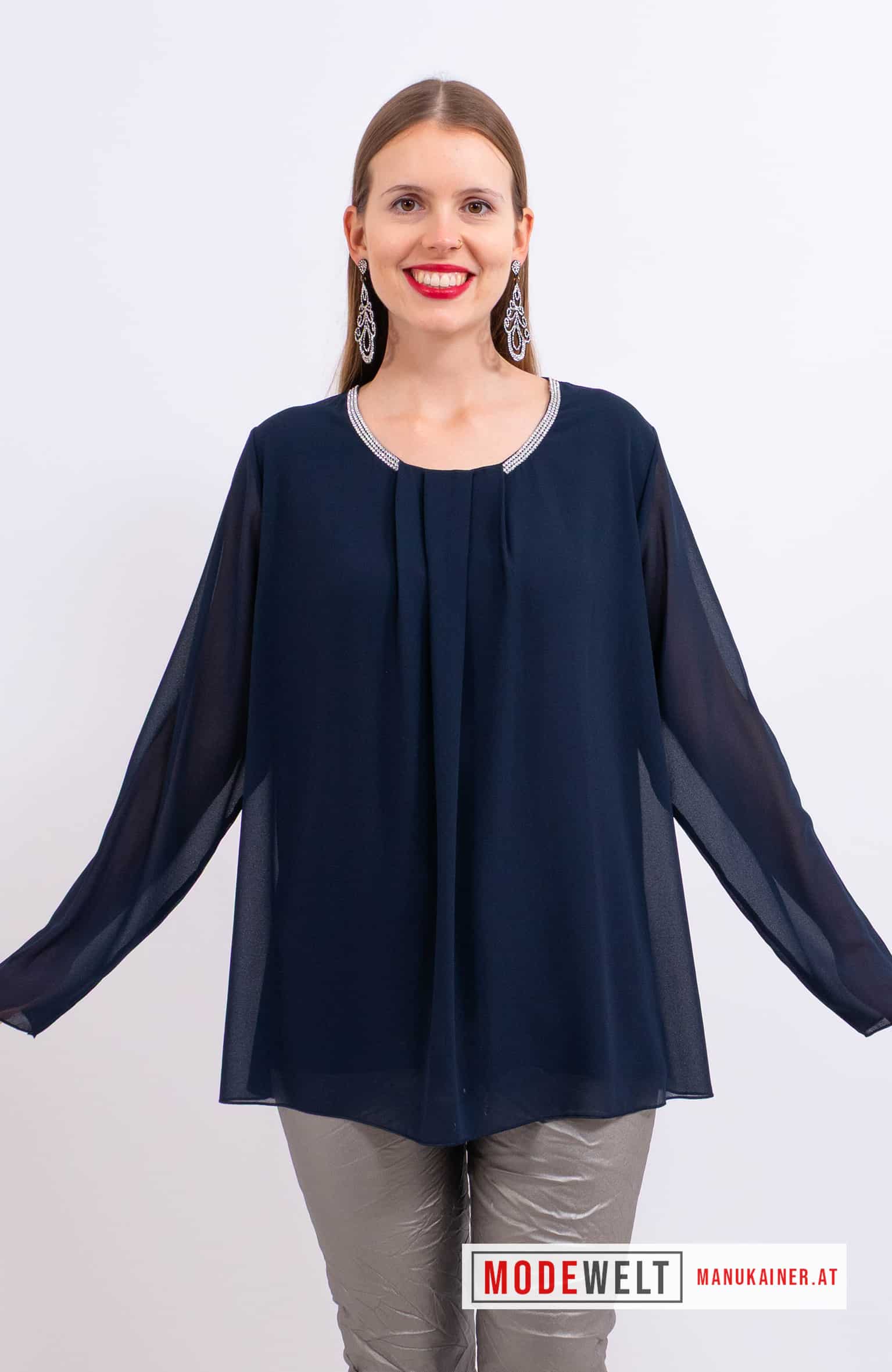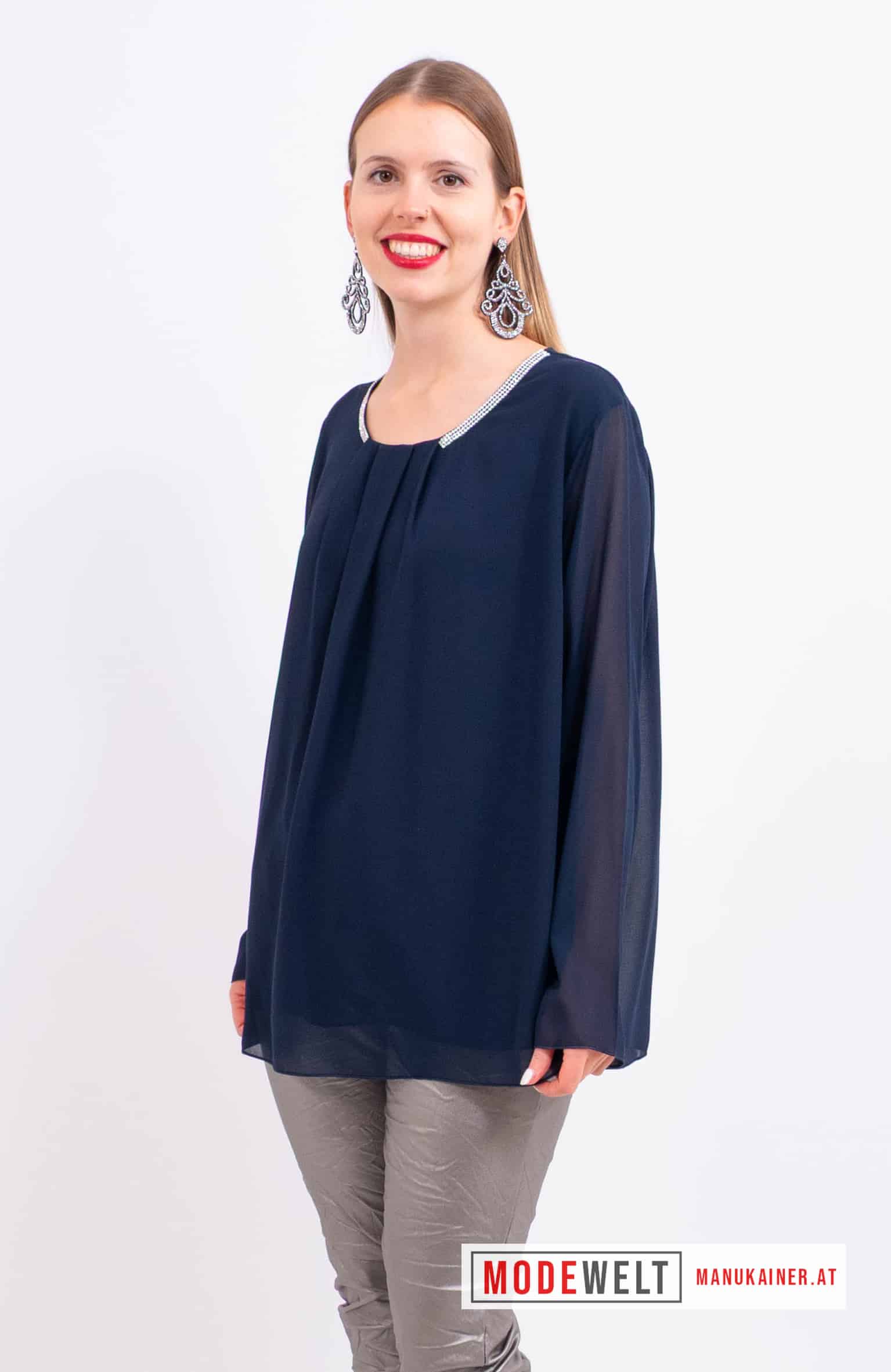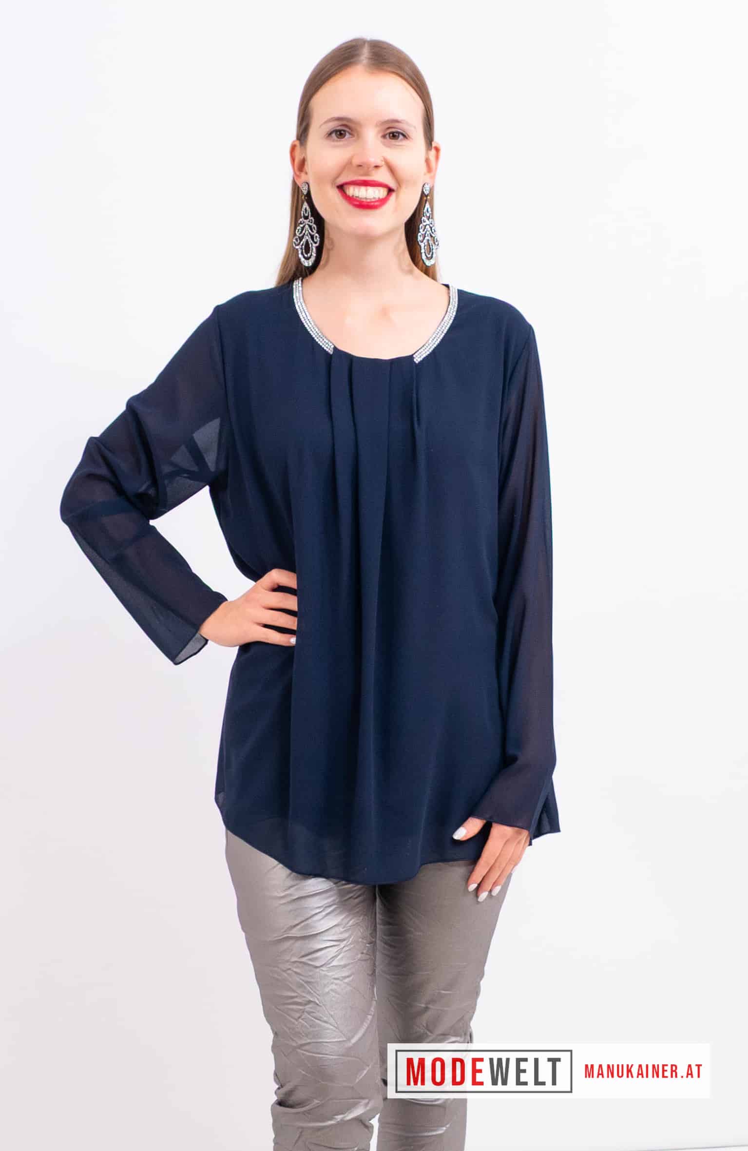 BlusenTunika Antonella |Gr. UNI 38-44/46|. Edle Schlupfbluse mit unterfüttertem Vorder- und Rückenteil und extravaganten, entzückenden Glitzersteinverzierungen am Halsausschnitt!