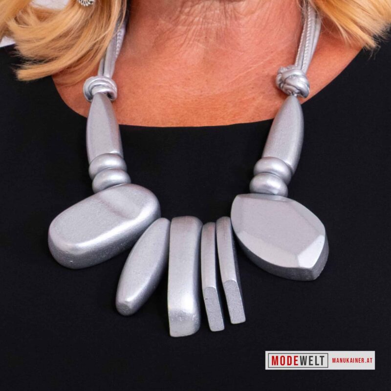 Länge ca. 45 cm. // Material: Metall unedel, Kunststoff, Holz, CordolinoBand, Farbe: Silber | // Kategorien: Halsketten,Graustyles,,,,,,x63x,x27x, // Artikelnummer: 4187.