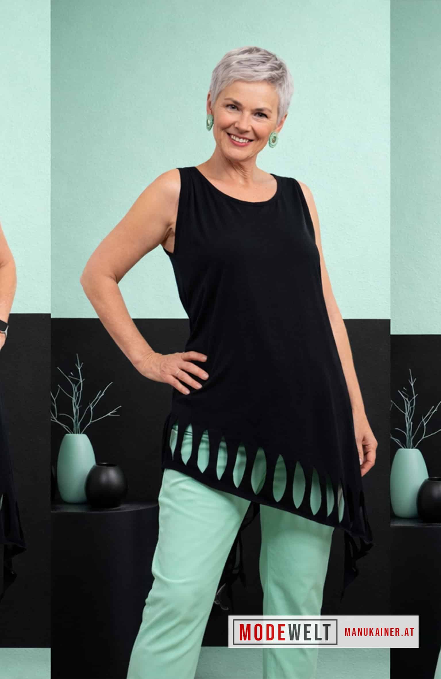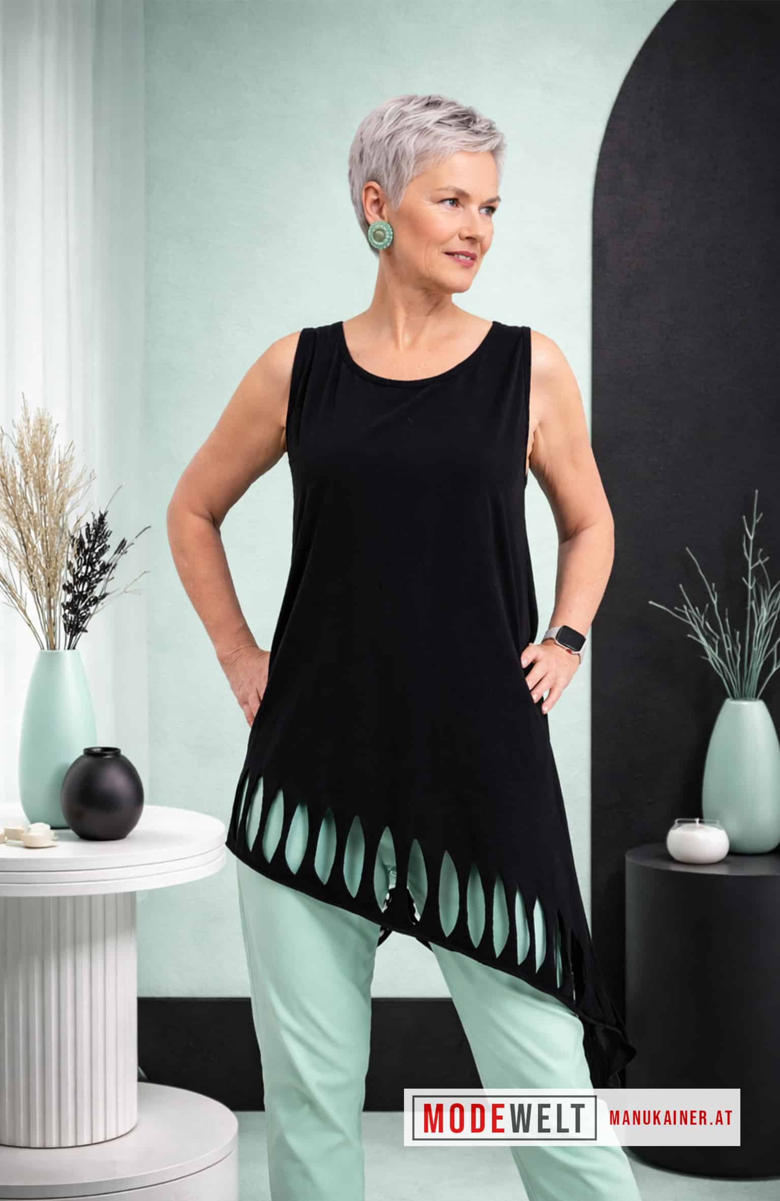 Entdecken Sie dieses extravagante und ärmellose Longshirt in einer asymmetrischen Form, das Ihren Look auf ein neues Level hebt. Die zipfenartige Ausstellung und die extracoolen Cutouts am Saum sorgen für einen außergewöhnlichen und modernen Look. Dieses kombistarke und ausgefallene Styleteilchen lässt sich sowohl zu lässigen als auch zu schicken Outfits perfekt ergänzen und verleiht Ihrem Look das gewisse Etwas. Das DesignLongshirt Trendy Black ist ein Traum für alle modebewussten Frauen, die Wert auf Individualität und Extravaganz legen. Setzen Sie ein modisches Statement mit diesem atemberaubenden Styleteilchen und lassen Sie sich von den neuesten Trends inspirieren!