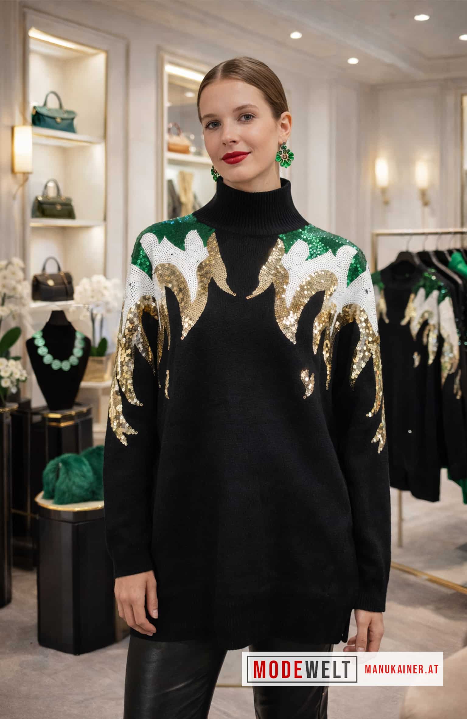 Schwarzer Pullover in fester, dünner Strickform mit edler, extravaganter Paillettenverzierung am Ausschnitt und im Schulterbereich. Top Design, Top Qualität, Top Bequemlichkeit!