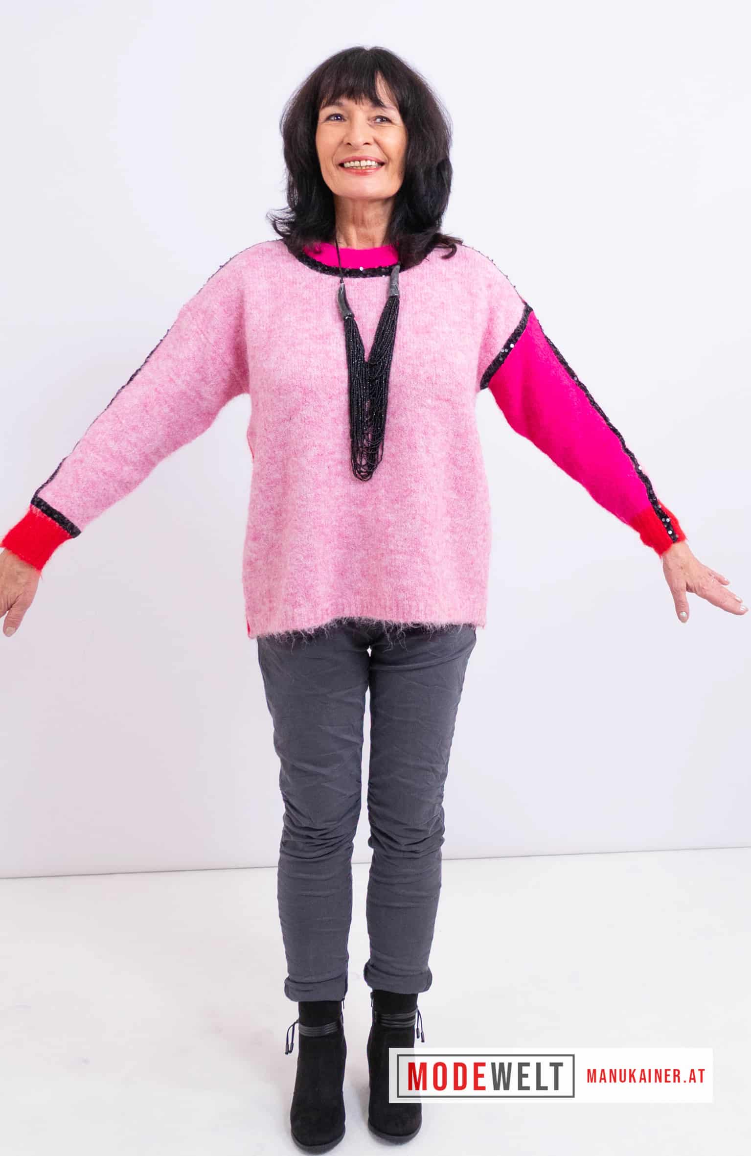 DesignPulli Keyla |Gr. UNI 40-46/48|. Unser DesignPulli Keyla vereint lässigen Chic und edlen Stil in einem. Dieser feine Oversized-Strickpulli bietet ultimativen Komfort dank des kuscheligen Materialmixes und seiner dünnen Qualität. Die Paillettenlängsstreifen, die sich über die Ärmel erstrecken, verleihen diesem Pulli einen Hauch von Glamour. Ob lässig zur Jeans oder elegant für den Ladieslook, dieser Pulli ist ein wahrer Alleskönner in Ihrem Kleiderschrank.