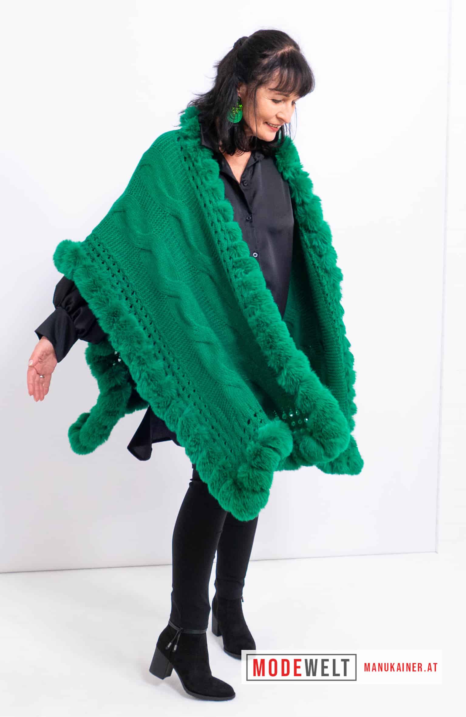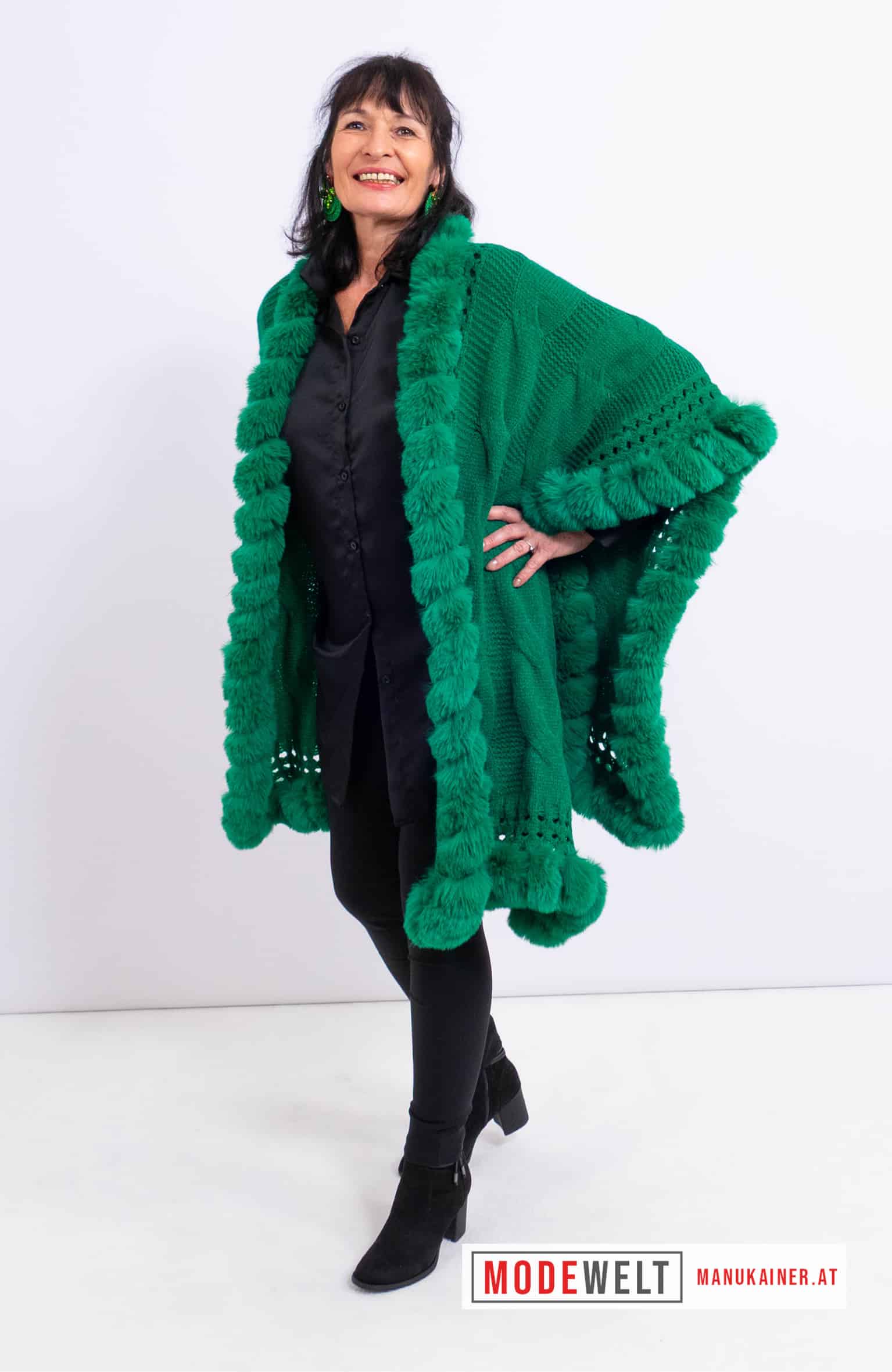 Der Edelponcho Alexa Green ist ein stilvolles Statement für Frauen, die das Besondere lieben. Das kräftige Grün verleiht jedem Outfit Frische und Ausdruckskraft, während die edle Pelzchenumrandung dem Design eine luxuriöse, elegante Note schenkt.