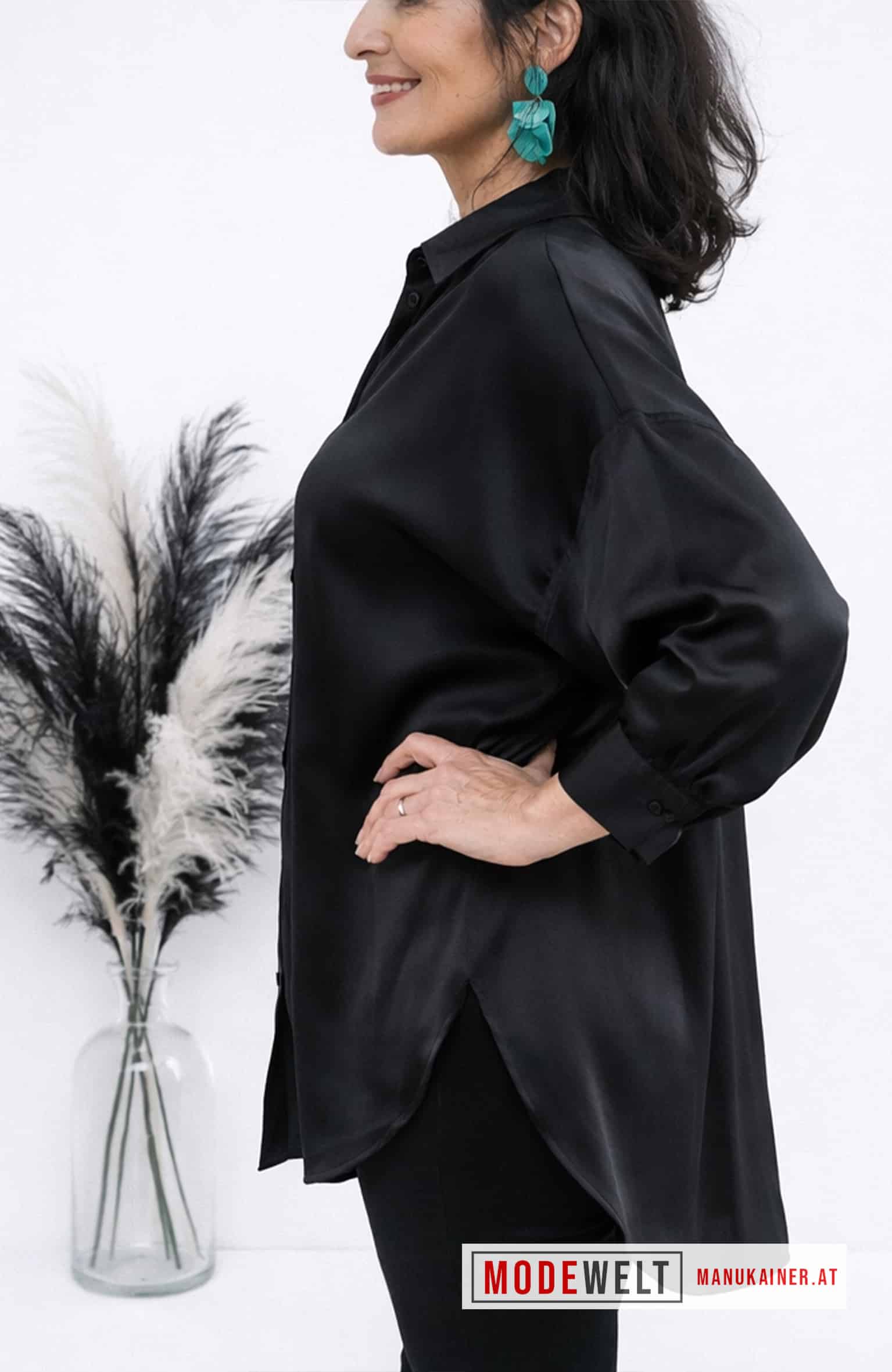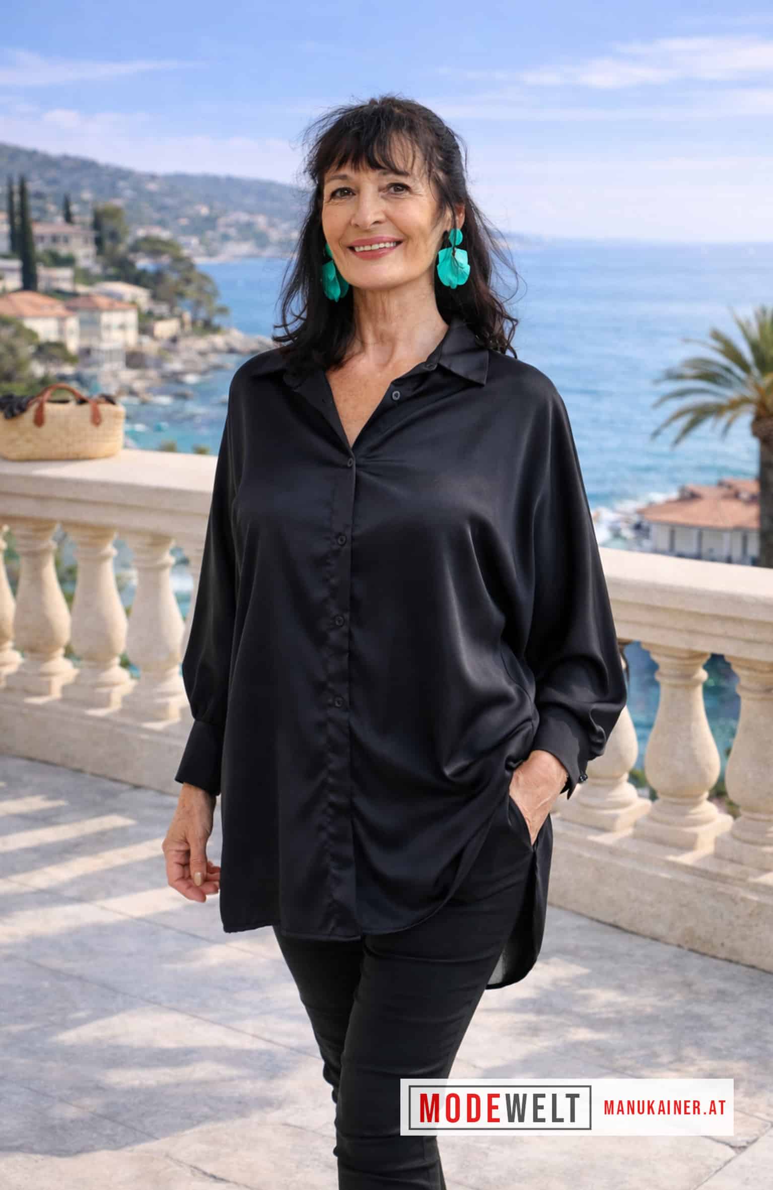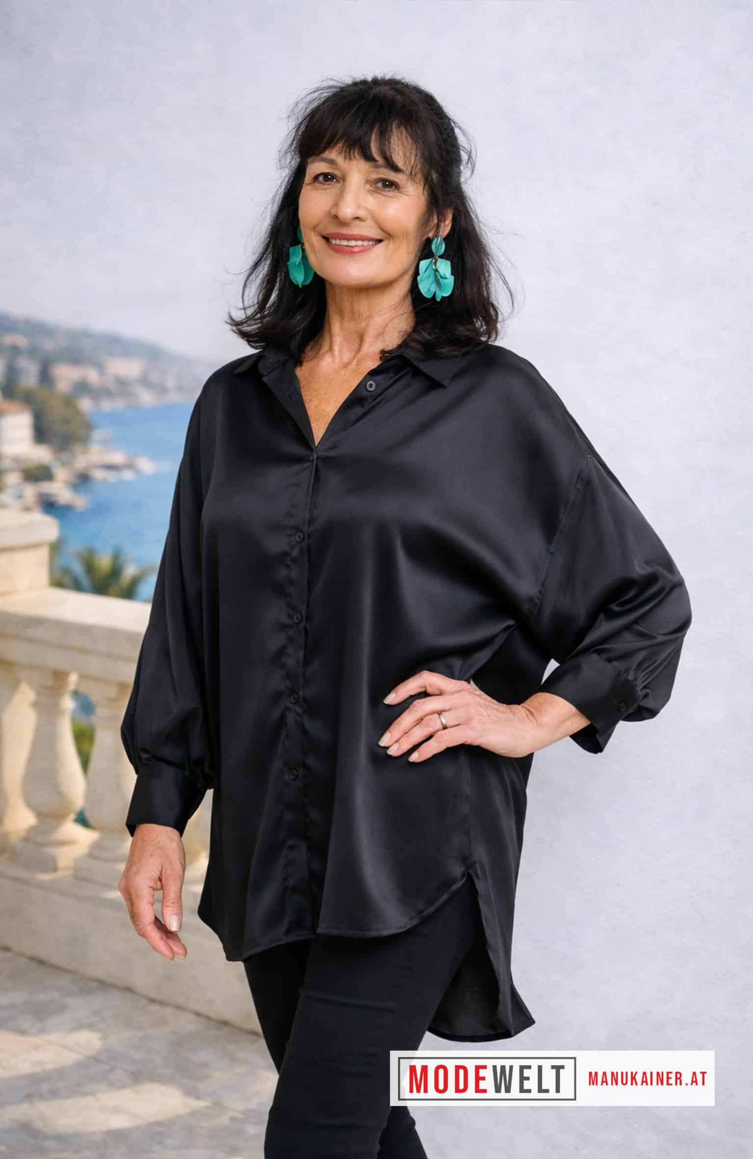 Die Fledermausärmelbluse Schwarz Elegance überzeugt durch ihre zeitlose Eleganz und den leichten, fließenden Look. Der lockere Schnitt umspielt die Figur sanft und sorgt für ein angenehmes Tragegefühl. Ideal für den Alltag oder stilvoll kombiniert für besondere Anlässe.