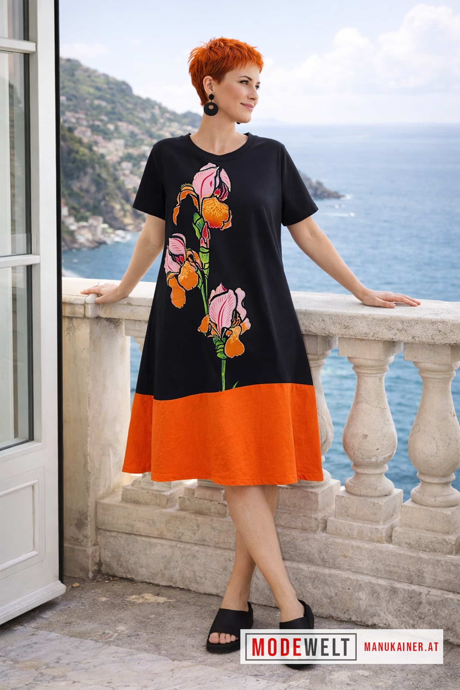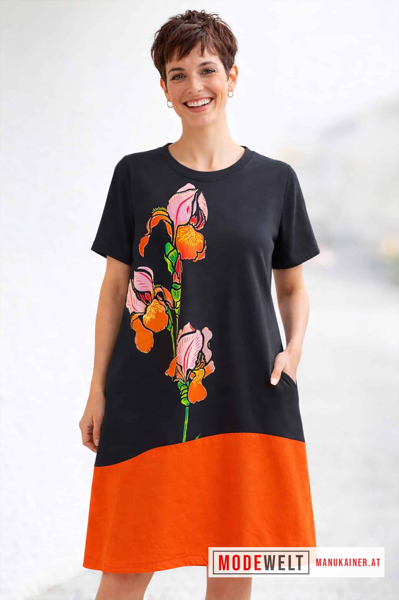 „Orange Elegance“ strahlt pure Sommerfreude aus. Die weiche Baumwollqualität mit leichtem Stretch sorgt für hohen Tragekomfort, während der ausdrucksstarke florale Print mit funkelnder Glitzerumrandung zu einem stilvollen Blickfang wird. Die locker fallende Silhouette schenkt Bewegungsfreiheit und unterstreicht eine feminine Ausstrahlung. Dank praktischer seitlicher Einstecktaschen verbindet dieses Kleid Eleganz mit entspanntem Komfort für sonnige Tage.