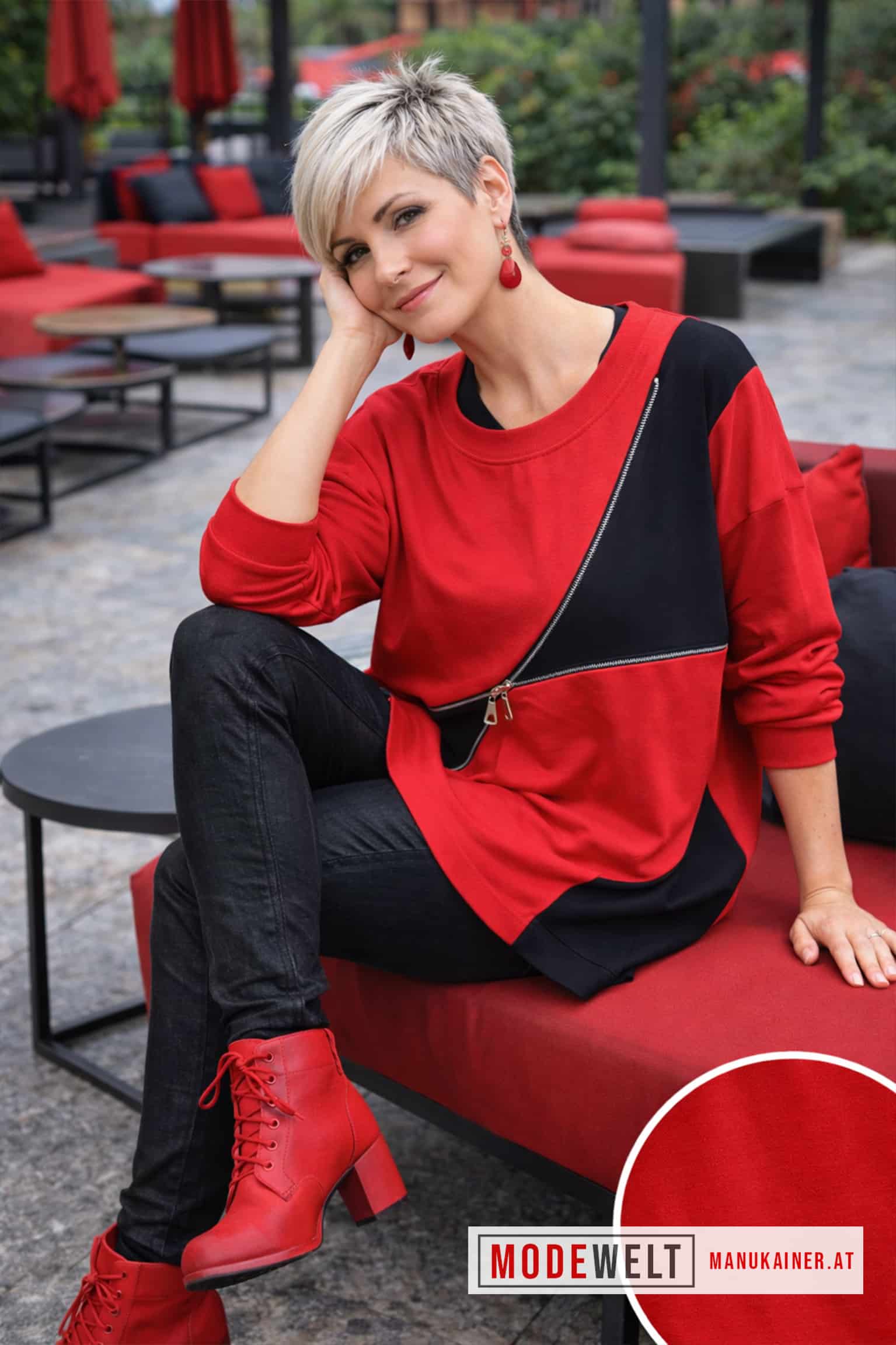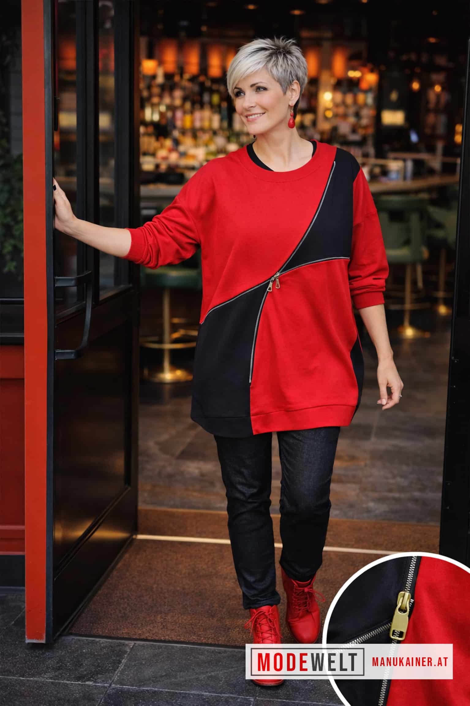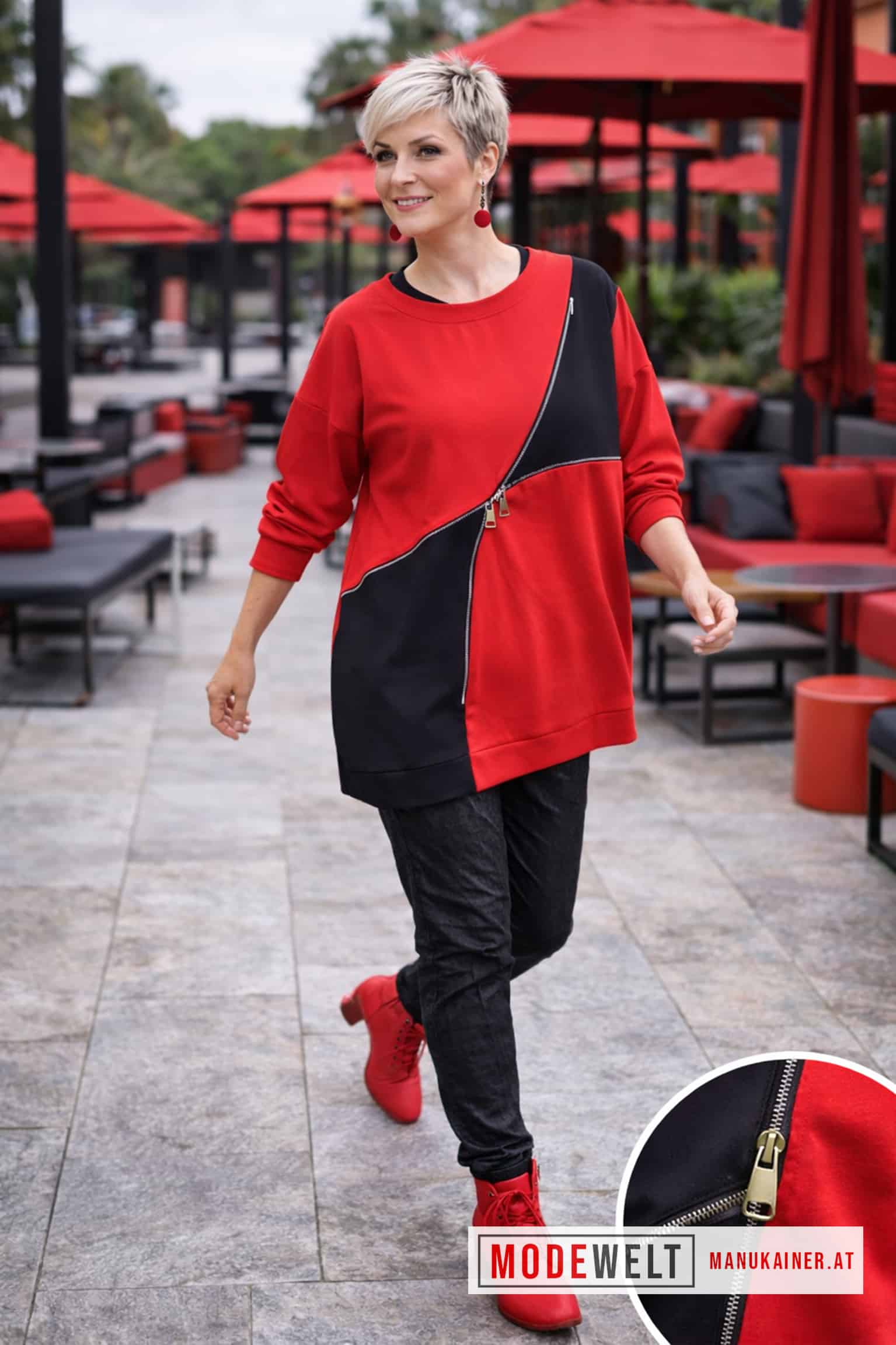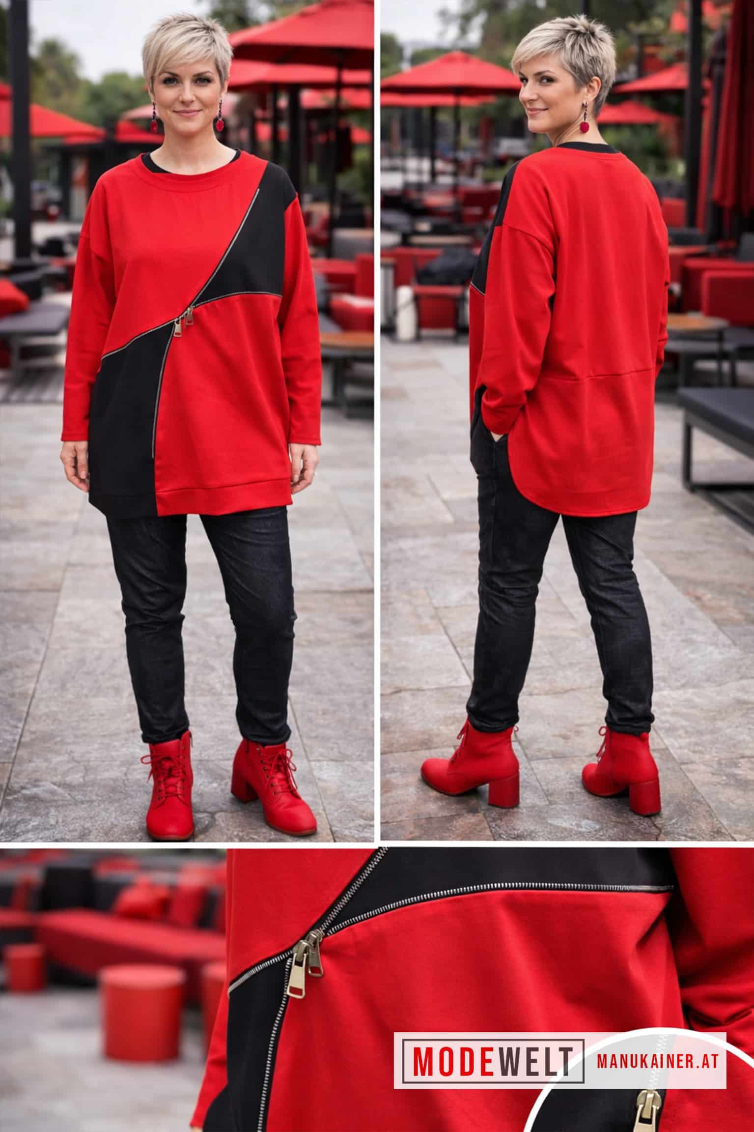 Der Sweater Lina begeistert mit einer kraftvollen Farbkombination und einem außergewöhnlichen Design. Die asymmetrische Teilung mit dekorativem Reißverschluss verleiht dem Look Dynamik und Individualität.