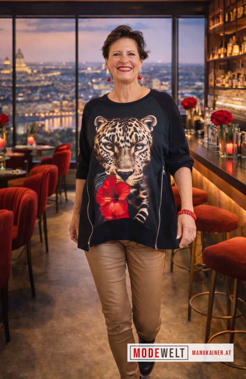 Der Sweater WildPower vereint Stärke und Weiblichkeit in einem einzigartigen Design. Der detailreiche Leopardenprint mit roter Blüte bringt pure Ausdruckskraft in dein Outfit.