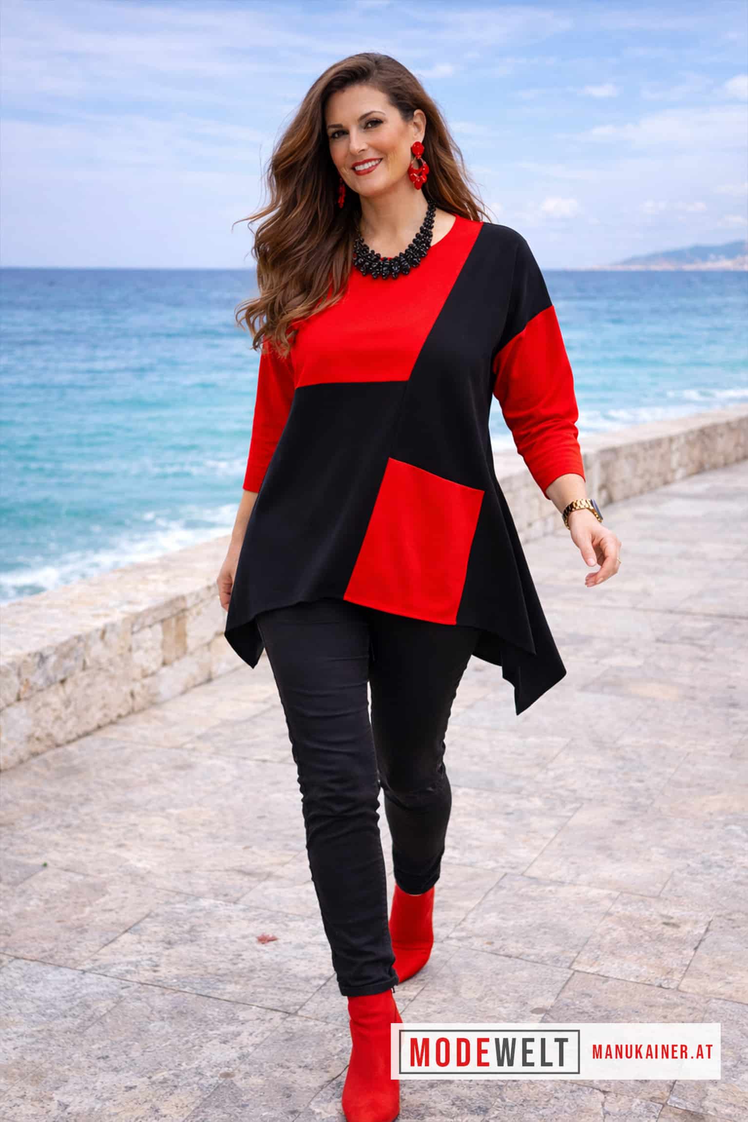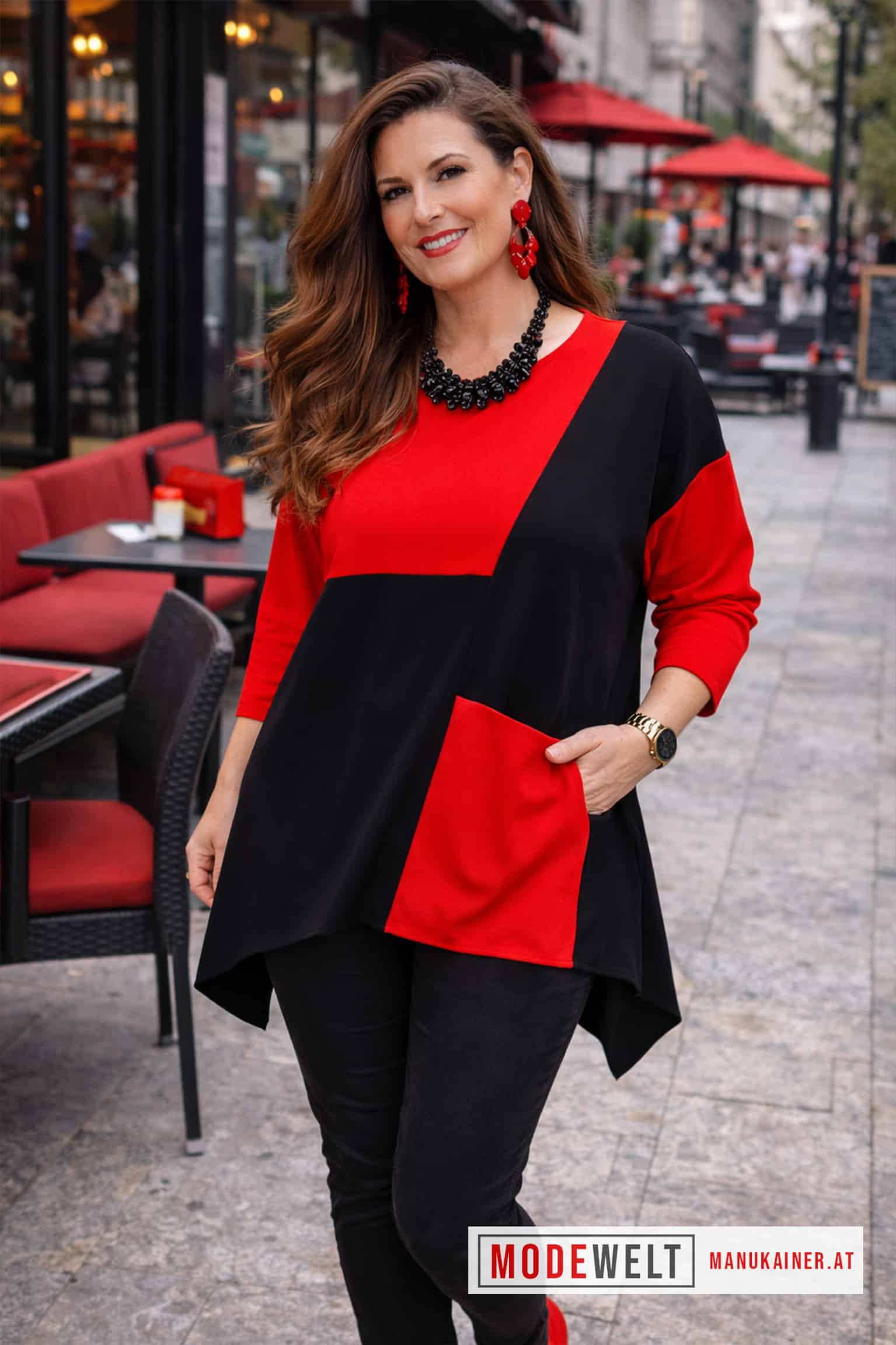 ✨ Die kontrastreichen Schwarz-Rot-Applikationen verleihen dem Look eine besondere Dynamik.