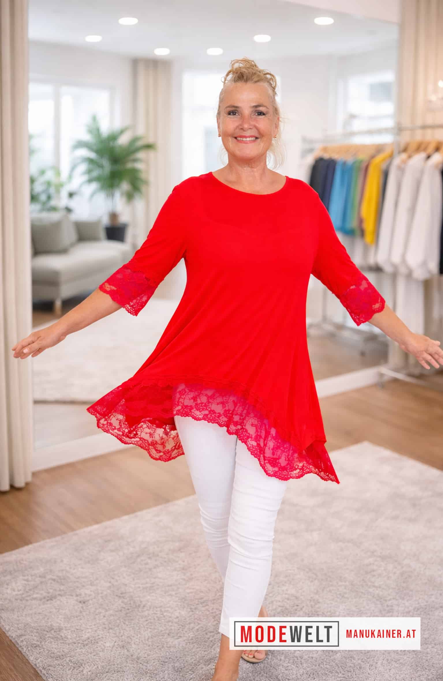 Tauche ein in die Welt der Eleganz mit unserem *UnderSweety Red* mit 3/4 Spitzenärmeln. Diese bezaubernde Kreation besticht durch eine breite Spitze am Saum und an den Ärmeln, die feminine Akzente setzt. Der leicht ausgestellte Schnitt sorgt für eine schmeichelnde Silhouette.