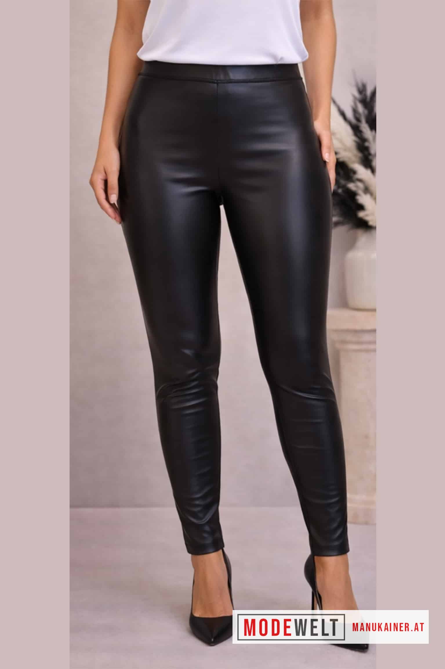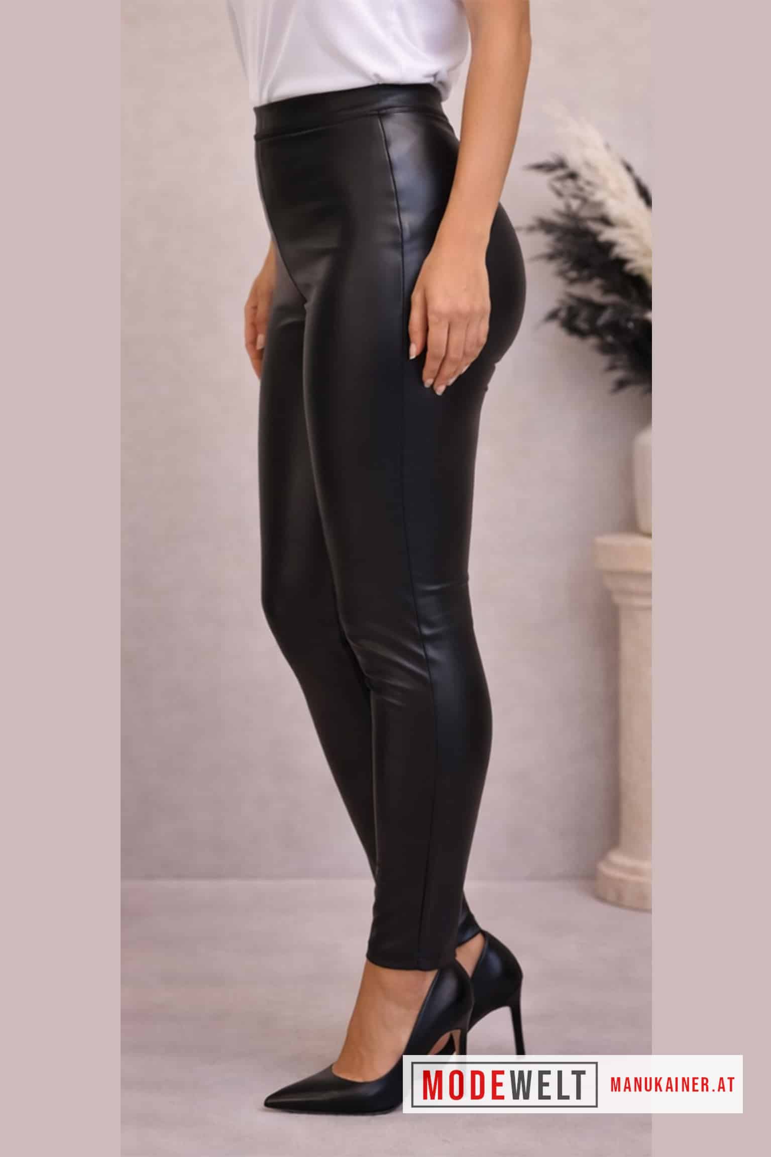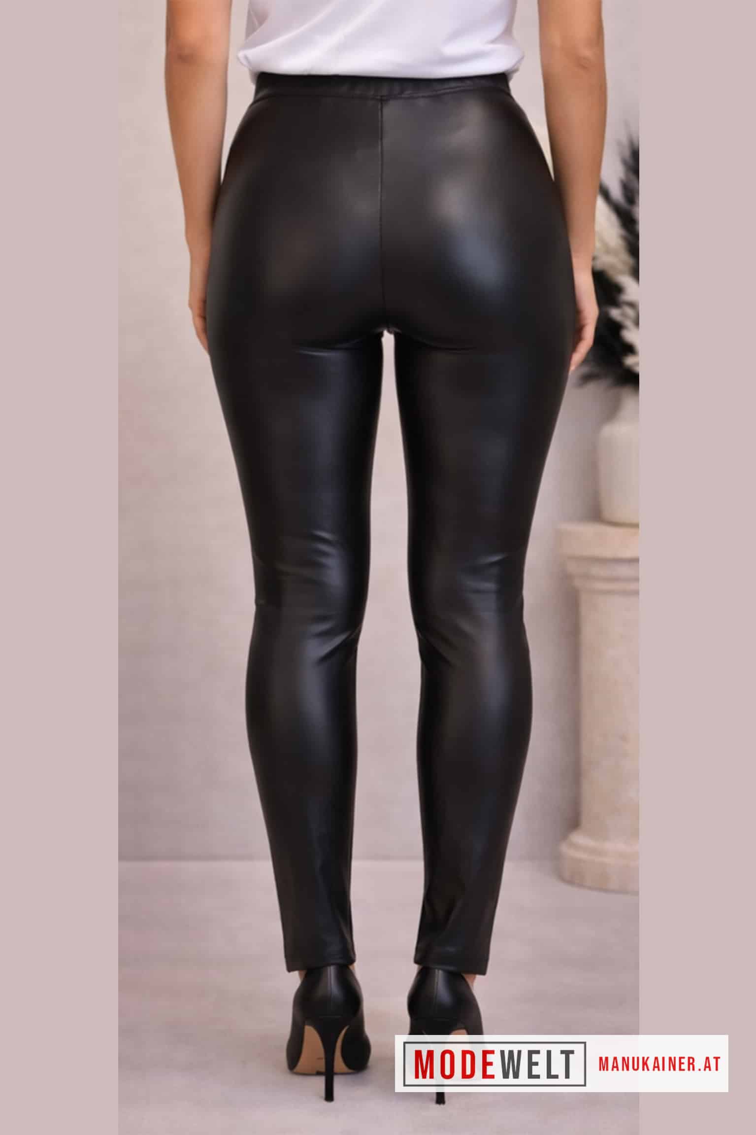 Diese edle Lederleggings verbindet modischen Glamour mit hohem Tragekomfort. Die hochwertige Lederoptik verleiht jedem Outfit eine moderne, stilvolle Ausstrahlung, während das elastische Material aus 95% Viscose und 5% Elasthan für eine perfekte Passform sorgt. Der figurbetonte Schnitt schmiegt sich angenehm an den Körper an und betont die Silhouette auf elegante Weise – ideal für stilvolle Alltagslooks oder besondere Anlässe.